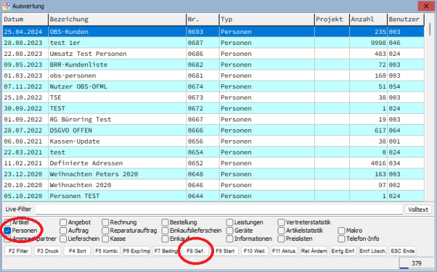 • Mit der F8-Taste werden Ihnen die gefundenen Datensätze in einer Liste angezeigt. Sie können hiermit Entf Datensätze entfernen und mit Einfg weitere Datensätze hinzufügen. Es öffnet sich die Liste mit den Stammdaten des jeweiligen Auswertungstyps. Markieren Sie mit F5 die gewünschten Datensätze und übernehmen Sie diese mit F2.