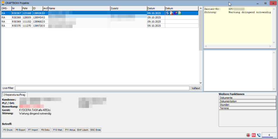 In dieser Liste können Sie die Craftboxx-Projekte sehen, die Sie z.B. in der Reparaturauftragsliste per Rechtsklick in Craftboxx übernommen haben.